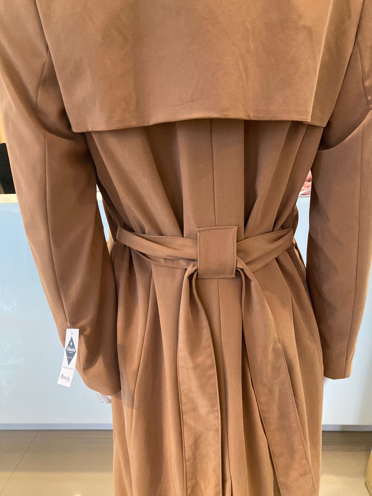 Possui cinto sem fivela (amarrado) do mesmo tecido da peça. Passantes no próprio tecido.