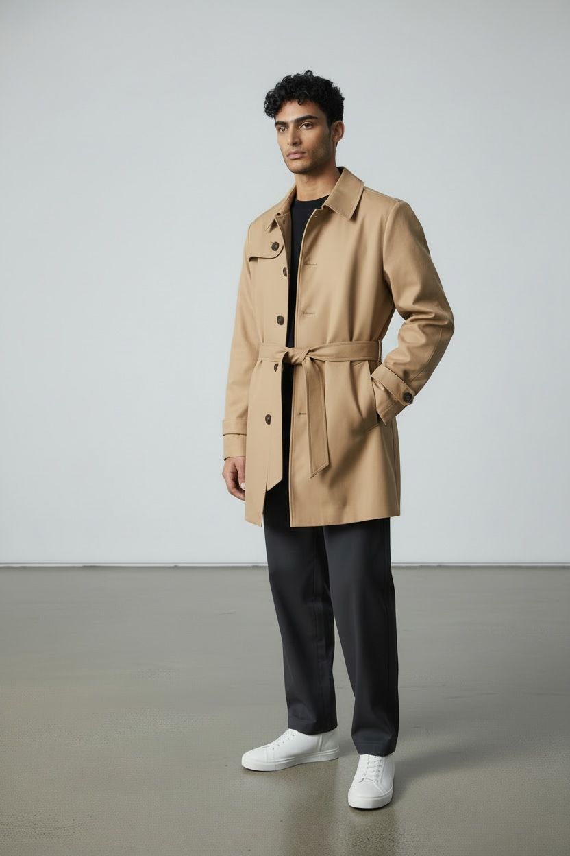 Sobrecapa nas costas com botão, com cinto, 2 bolsos externos e 2 bolsos internos.