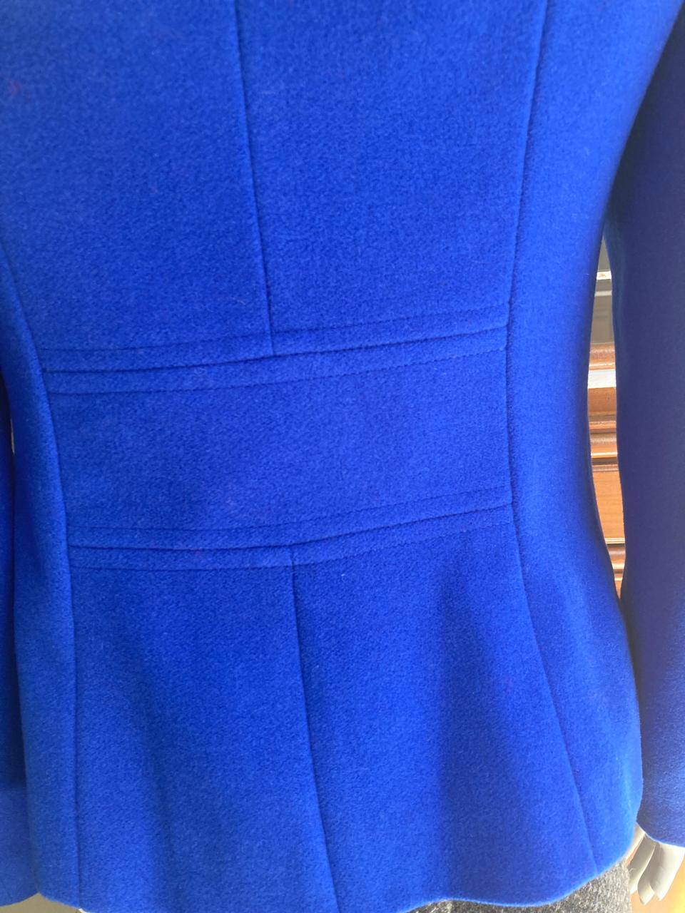 Comprimento de um blazer curto, até a cintura, acinturado, corte slim (desenhado para ser mais justo e próximo ao corpo, acompanhando a silhueta sem apertar exageradamente.